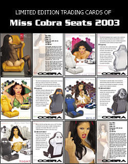Click to get your set of limited edition Miss Cobra Seats 2003 trading cards. These full-color cards feature Miki in all her glory. And if you're lucky you'll receive the ultra-rare sixth card. Hurry, quantities are limited!