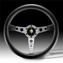 MOMO Prototipo steering wheel with 3 semi-dished anodized spokes in black or silver, suited for all types of driving: rally, track, or road. Complete with a horn button. Available in black leather with black or silver spokes. PCD: 70mm with 6 bolt pattern. Dish: 37mm. Diameter: 350mm.