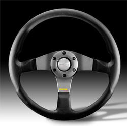 The MOMO Tuner is a flat-orientated steering wheel with 3 slender anodized spokes, complete with a horn button. Suited for all types of driving: rally, track, or road. Thumb notched anatomical grip area. Available in black leather with black or silver center. Diameter: 350mm.