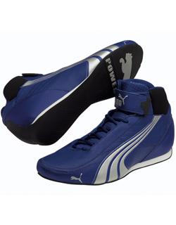 The PUMA Kart Cat Mid II is for the young karting professional who demands the best footwear protection and performance. The PUMA Kart Cat Mid II is constructed of full-grain leather and synthetic leather, PUMA's proprietary CM-EVA/duo Cell at its midsole, and an oil-resistant non-skid rubber outer sole. A positive Velcro closure at the mid-top shank with an enlarged cut-out in the Achilles area ensures freedom of movement front to rear at the ankle without sacrificing the necessary ankle protection from side to side. The PUMA Kart Cat Mid II kart shoe also features 'Barrel' lacing with protected soft eyelets ensuring quick lacing and proper conformation to the foot improving pedal control and feel. A perforated tongue at the center of the shoe promotes transpiration and removes heat from the driver's foot. "Power" and "Brake" livery along with the PUMA logo on the sole is the hallmark of a Karting professional who demands the best. Non-fireproof. Available in red/white, black/silver, black/white, blue/white, and white/red (body/form-stripe). Sizes: 36-47.