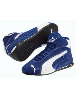 The PUMA Repli Cat Mid shoe features a positive Velcro closure at the height shank with an enlarged cut-out in the Achilles area ensuring freedom of movement front to rear at the ankle without sacrificing the necessary ankle protection from side-to-side. Barrel lacing with protected soft eyelets ensures quick lacing and proper conformation to the foot improving pedal control and feel. Non-fireproof. Available in black/red, red/white, blue/white, green/white, and yellow/lt. blue color combinations (body/form-stripe). Sizes: 36 - 46.