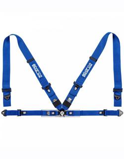 The Sparco 4PT competition-style seat belt system incorporates a light-weight camlock, 2" lap belts with pull/up adjusters and clip-in ends, and 3" shoulder belts with wrap-around and clip-in ends installed. Sparco's smooth-action aluminum cam-lock buckle is combined with a built-in load-spreading waist pad to help make this harness set comfortable and easy to use. The 4 mounting points include snap-in hardware (complete with eyebolts) for a simple installation. FIA 8854-1998 Approved. Available in red, blue, or black.