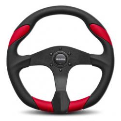 MOMO Quark steering wheel with 3 flat style black anodized spokes, complete with horn button. Suited for all types of driving: rally, track, or road. Anatomical urethane grip with black leather inserts. Available in black/black or black/red with black center. PCD: 70mm with 6 bolt pattern. Dish: 40mm. Diameter: 350mm.