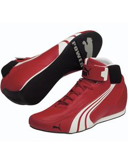 The PUMA Kart Cat Mid II is for the young karting professional who demands the best footwear protection and performance. The PUMA Kart Cat Mid II is constructed of full-grain leather and synthetic leather, PUMA's proprietary CM-EVA/duo Cell at its midsole, and an oil-resistant non-skid rubber outer sole. A positive Velcro closure at the mid-top shank with an enlarged cut-out in the Achilles area ensures freedom of movement front to rear at the ankle without sacrificing the necessary ankle protection from side to side. The PUMA Kart Cat Mid II kart shoe also features 'Barrel' lacing with protected soft eyelets ensuring quick lacing and proper conformation to the foot improving pedal control and feel. A perforated tongue at the center of the shoe promotes transpiration and removes heat from the driver's foot. "Power" and "Brake" livery along with the PUMA logo on the sole is the hallmark of a Karting professional who demands the best. Non-fireproof. Available in red/white, black/silver, black/white, blue/white, and white/red (body/form-stripe). Sizes: 36-47.