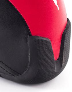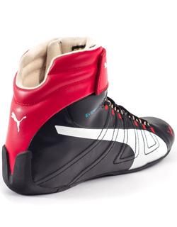 The PUMA EverFit + Pro race shoe, new for 2015, features the latest technology in foot stability and support for the race professional. The PUMA EverFit + Pro shoe features a dynamic lacing system that locks the upper and outer sole to the foot through a network of Kevlar cables extending from the top sole to the outer sole creating a complete dynamic support cage for the driver's foot. The PUMA EverFit + Pro race shoe features a soft full-grain leather outer shell offering exceptional comfort and protection, while a rounded heel cup and textured rubber outsole derived from F1 provides the ultimate in precise, delicate, and quick footwork. The PUMA EverFit Pro + shoe also incorporates a 'quick lace' system with soft Kevlar eyelets extending from the cage network enabling secure, easy, and fast conformation and proper support of the entire foot. FIA 8856-2000 and SFI 3.3/5 Approved. Available only in the black/white/red color combination. Sizes: 39-47 (7-13US).