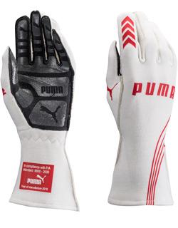 The PUMA Podio glove represents an out-seamed version of the Furio glove and incorporates the new graphic design features used by the Ferrari F1 pilots. The PUMA Podio glove represents a fusion of the Avanti and Furio gloves with an outside-seamed presentation combining all the latest technology available for the Motorsport professional. Designed for maximum grip and comfort, that Podio glove focuses on all contact points between the driver's hand and the steering wheel. Outside stitched and pre-formed sculptured finger construction on the palm side of the gloves complement the tactile rubberized pads strategically placed throughout the palm and finger areas of the glove. The Podio glove features a fully encompassing sculptured barrier of 180-gram knit Nomex covering both the back of the hand and throughout the interior of the hand, fingers, and palm. Ergonomically positioned rubberized tactile pads provide hardwearing and maximum grip within the palm area. FIA 8856-2000 approved. Available in red, blue, black, and white. Sizes: 8-12.