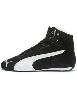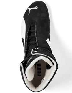 The PUMA Future Cat Mid Pro P is the epitome of minimalism and functionality of footwear for the race professional. Asymmetric lacing increases blood circulation, decreases lactic acid build-up/muscle fatigue, and improves heat dissipation within the driver's foot. Anatomically shaped foot plate, EVA wedge at the midsole, and waffle shoe technology maximize foot support, sensitivity, and agility in driver footwork. The PUMA Future Cat Mid Pro P features a unique three-panel, internal seam, pre-formed pig skin suede construction with a high toe box resulting in the ultimate durability, fitment, and comfort, as well as 25% lighter than conventional designs. Lace-up, mid-length closure at the shank with an enlarged cut-out in the Achilles area ensures freedom of movement front to rear at the ankle without sacrificing the necessary ankle protection from side to side. FIA Approved (8856-2000). Available in a black/white color combination. Sizes: 38-47.