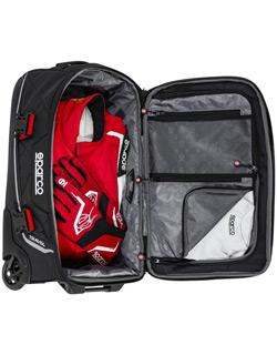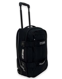 The Sparco Travel bag is the first Sparco rolling bag specifically designed as a "Carry-on" size for air travel. The Sparco Travel wheel bag is a stylish bag that features multiple internal pockets with protective padding around the duffle bag and a reinforced under compartment. Two Harness straps keep contents inside. A telescoping handle makes it easy to lift and roll. Available in 3 colors: black/red, black/silver, and black/black. Dimensions: H10"xW14"xL22"