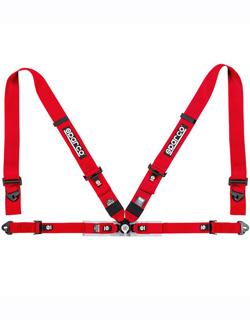 The Sparco 4PT competition-style seat belt system incorporates a light-weight camlock, 2" lap belts with pull/up adjusters and clip-in ends, and 3" shoulder belts with wrap-around and clip-in ends installed. Sparco's smooth-action aluminum cam-lock buckle is combined with a built-in load-spreading waist pad to help make this harness set comfortable and easy to use. The 4 mounting points include snap-in hardware (complete with eyebolts) for a simple installation. FIA 8854-1998 Approved. Available in red, blue, or black.